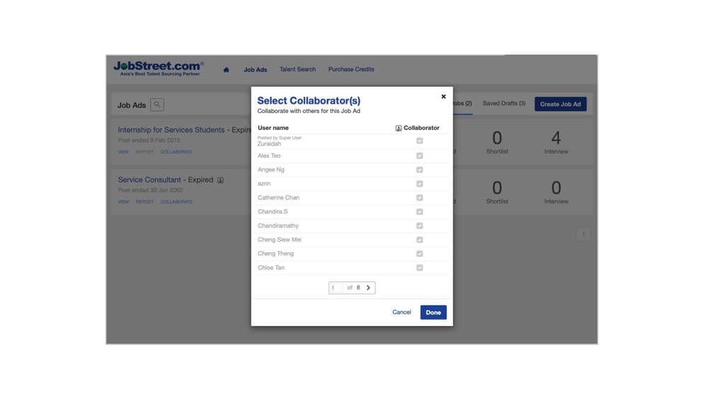 By using Jobstreet’s Collaborative Screening feature, a system administrator is able to provide access to colleagues (other hiring managers, for example) to view selected job ads posted. Selected collaborators can then work together with key hiring decision makers in the organisation using the same platform, all at the same time.