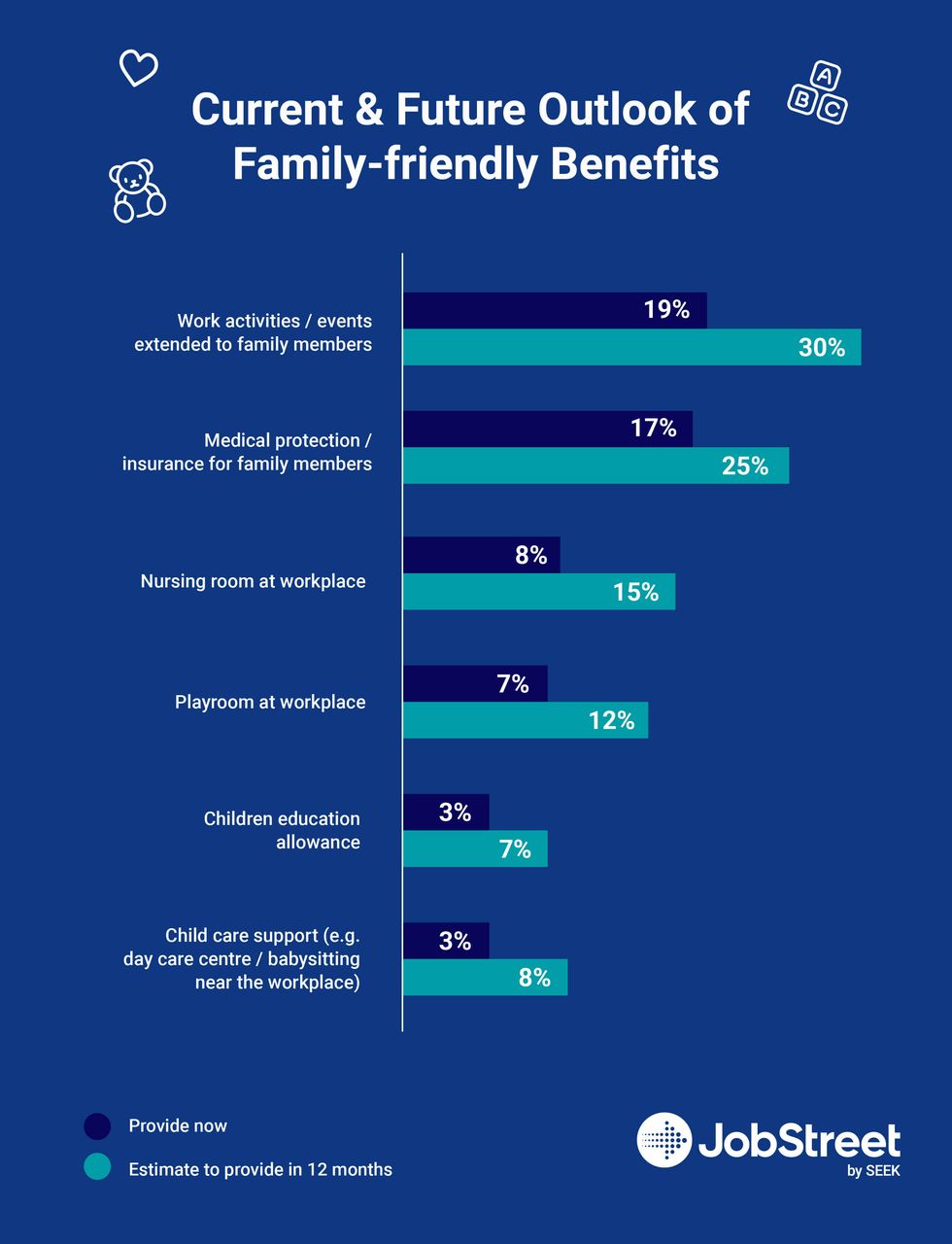 Benefits are especially important to workers who are married and have children. Family-oriented perks are among the top benefits that companies are planning to provide, based on Jobstreet’s 2022-2023 report. 11% of hirers plan on extending work activities to employee family members, while 8% plan on providing more or better medical protection or insurance to family members. Does your company have enough employee benefits that even extend to their loved ones?