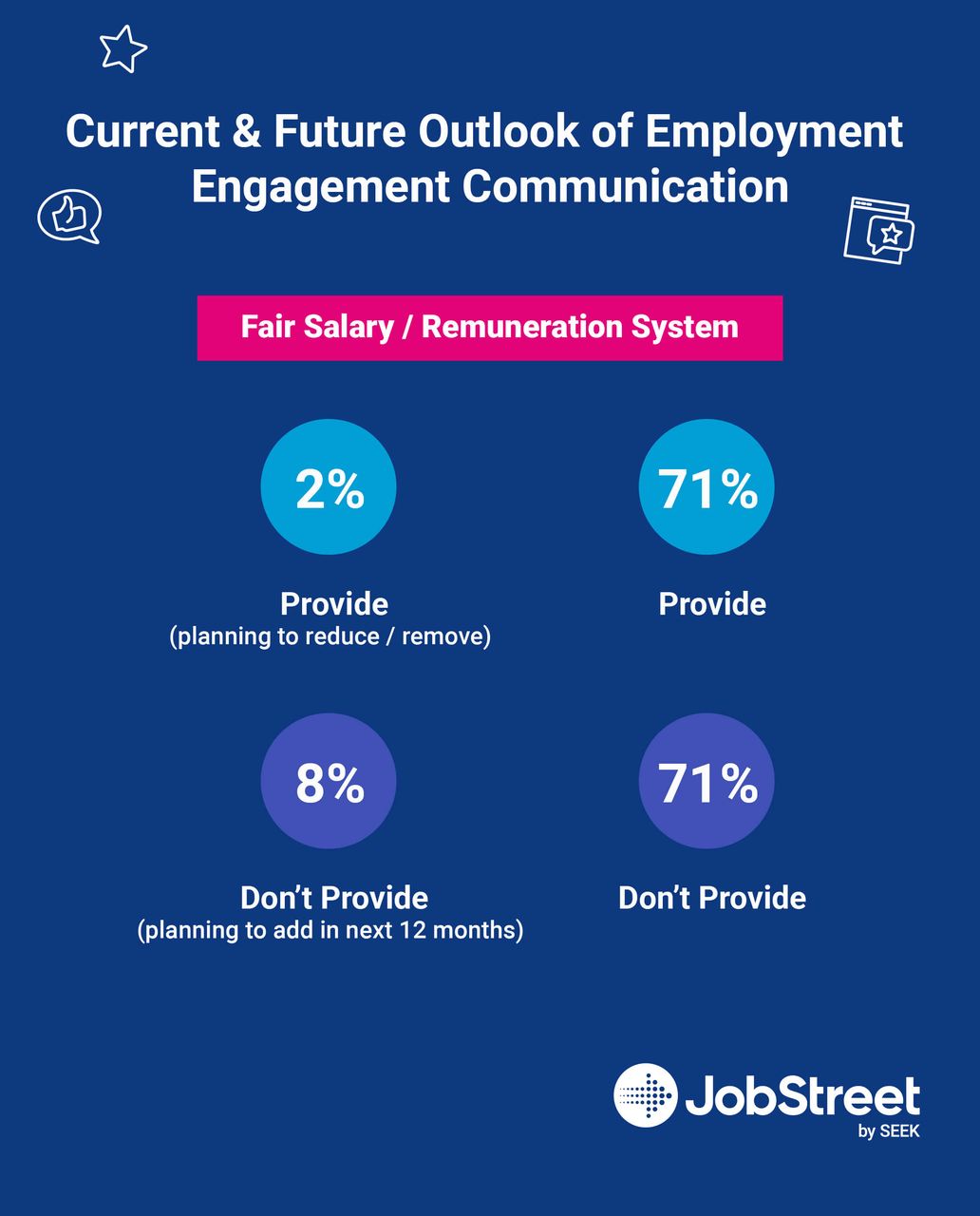 Your company should make a reassessment of your current compensation packages. Is the package you are offering fair? How does it compare to the ones offered by your competitors? Jobstreet’s 2022-2023 report reveals that 71% of employers in Malaysia offer what can be considered “fair compensation,” while 8% plan on adding or improving their salary packages in the next 12 months. This shows that most hirers in Malaysia see fair compensation as a point of emphasis and improvement. To attract top talent to your company, you need to stay competitive in this area.