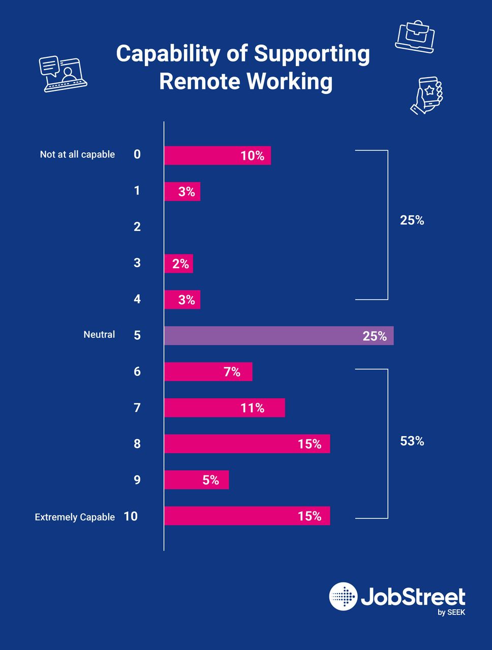 This can be a market inefficiency when it comes to hiring, as only 23% of companies in Malaysia have plans to implement a hybrid model within the year. Meanwhile, a little over half of the companies in Malaysia say that they are capable of supporting their employees remotely. Is your company willing or prepared to give employees remote work optionality? If yes, then that can be an advantageous Employee Value Proposition.