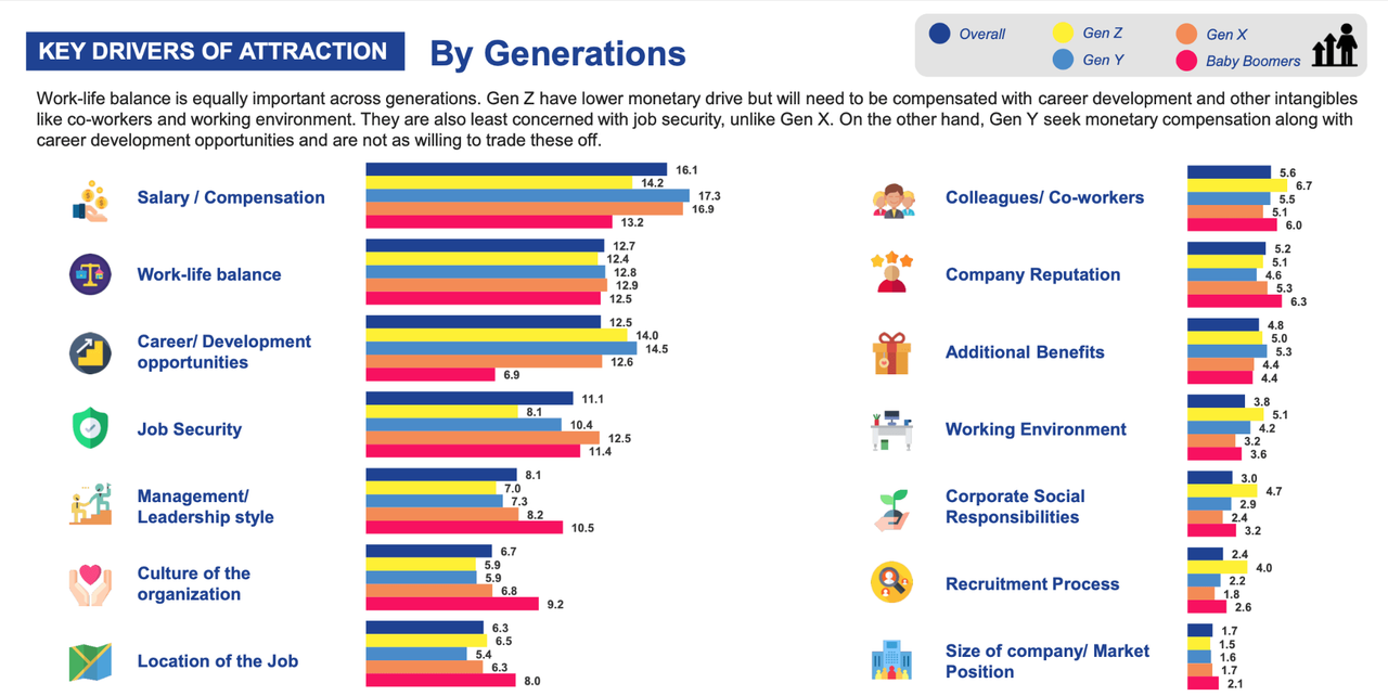 Salary and Compensation along with Work-life Balance applied to all Malaysian talents but not for Gen Z. They prefer Personal Growth and Career Development as they are just starting to enter the workforce.
