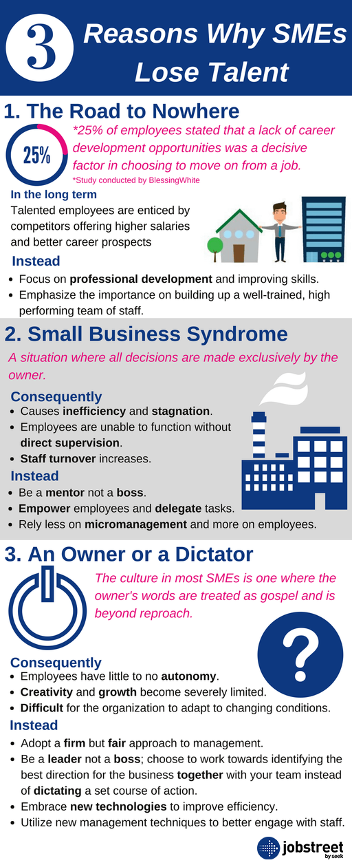 Thus, rather unfortunately SMEs tend to lose their more talented or ambitious candidates to larger organizations or MNCs which offer bigger salaries with promises of career progression. This leaves most SMEs in the unenviable position of training talented employees only to lose them to larger, more established organizations down the road.